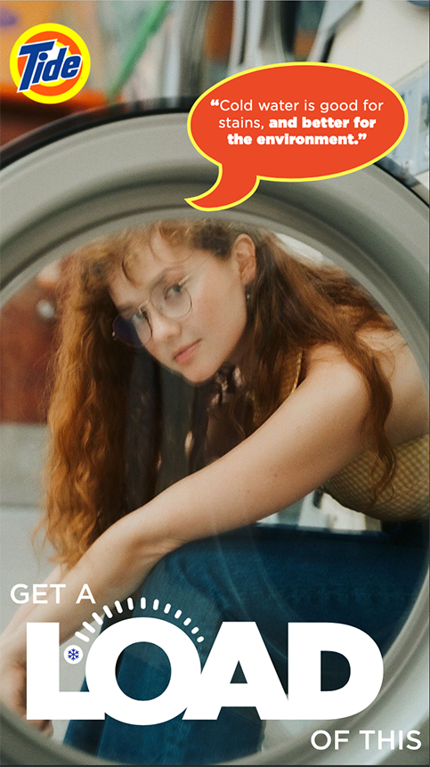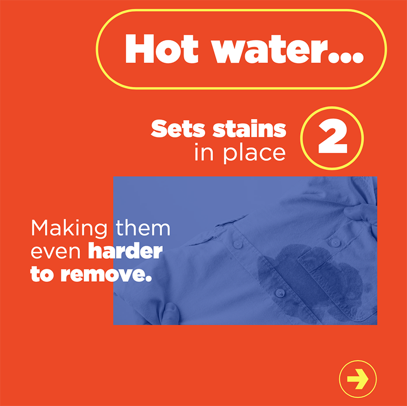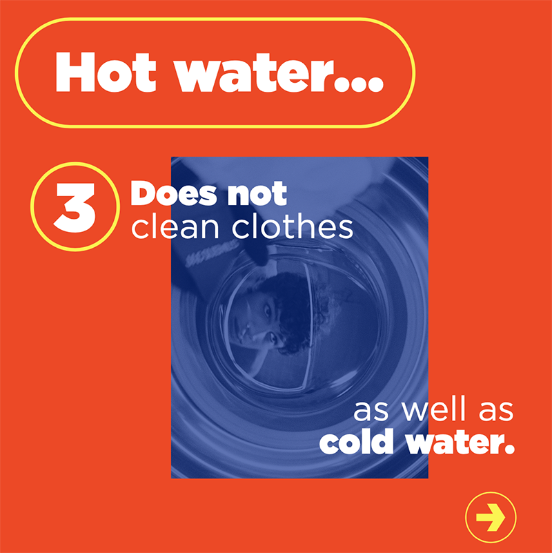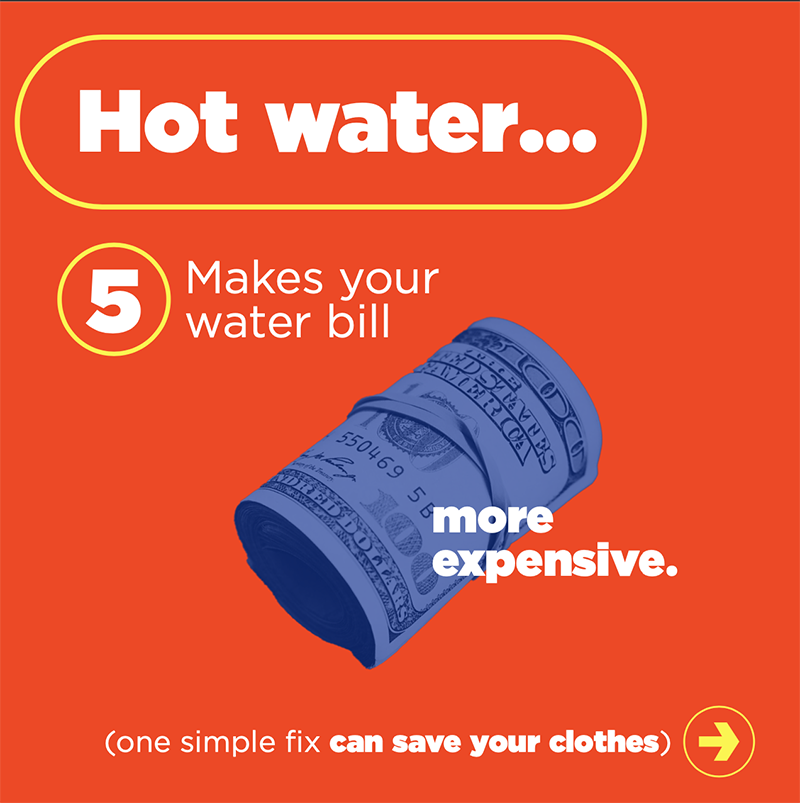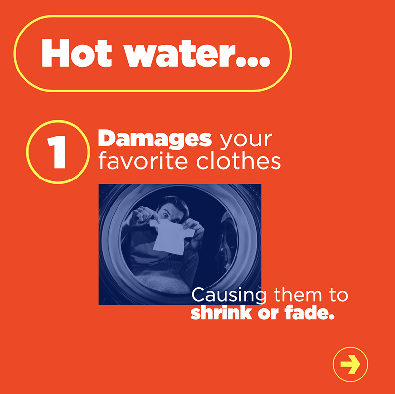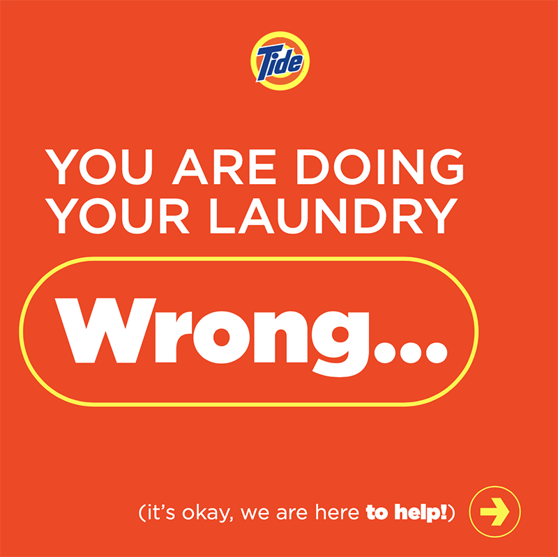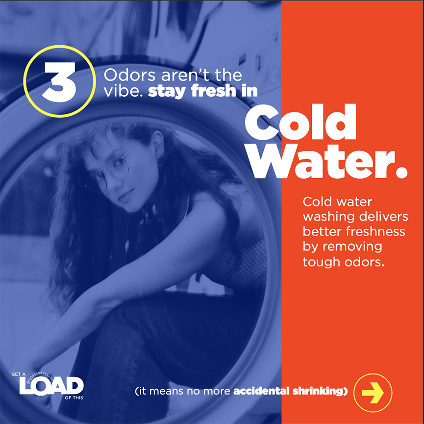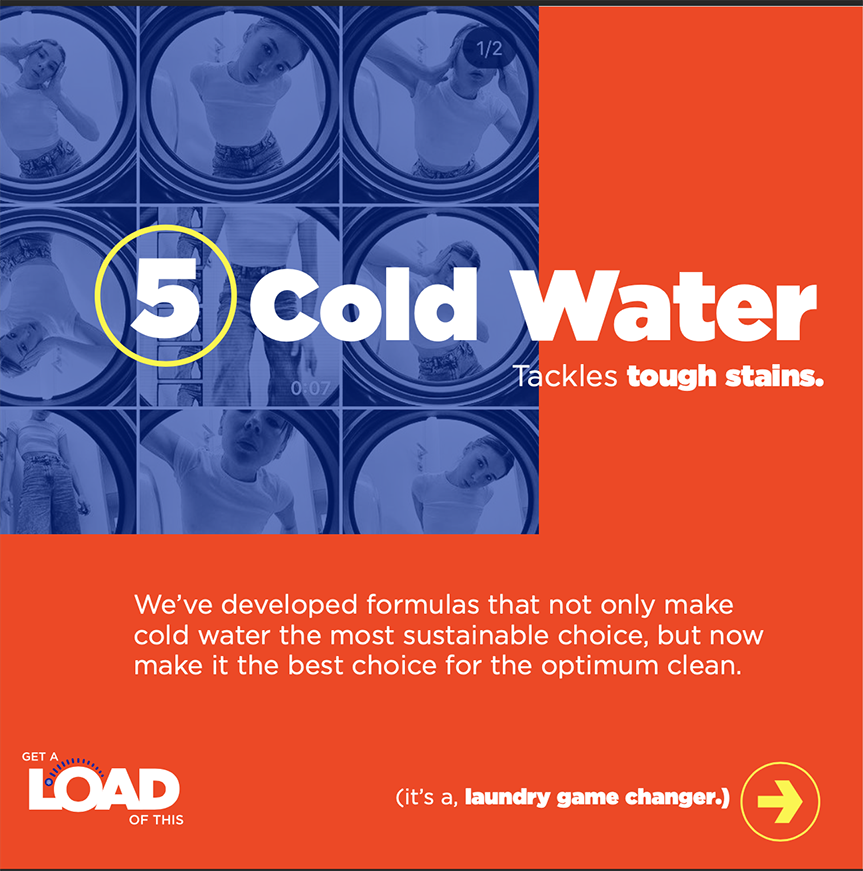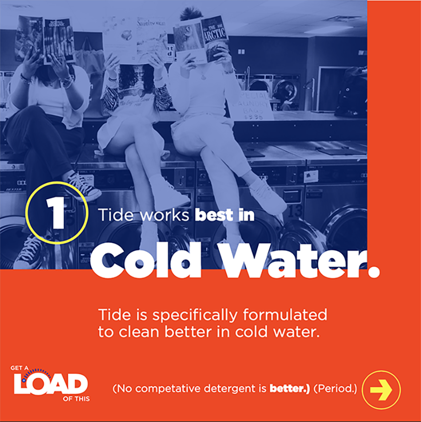 As you can tell, the copy in this second iteration of social media posts is subpar, almost…bad even. My goal was shock factor, that was my strategy behind the first slide “YOU ARE DOING YOUR LAUNDRY WRONG…” Coming from the most used laundry detergent brand in the world, I felt that this would make people take a step back and really think, well if Tide is telling me I’m doing it wrong then maybe I actually am. The rest of the copy isn’t great simply because I couldn’t do it all. I wanted to be the girl who made the already written words look cool, not be the girl who wrote them. I chose to add in more blue, as it connotes the idea of cold water, (it gets better I promise).