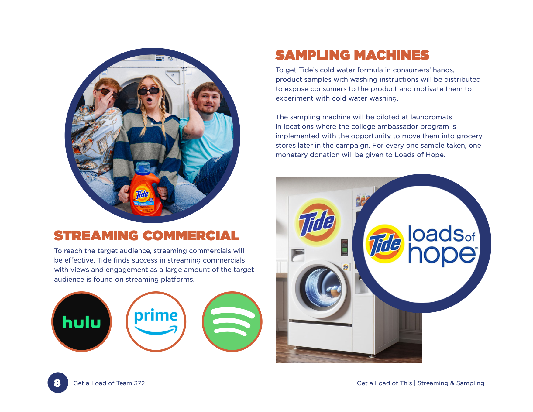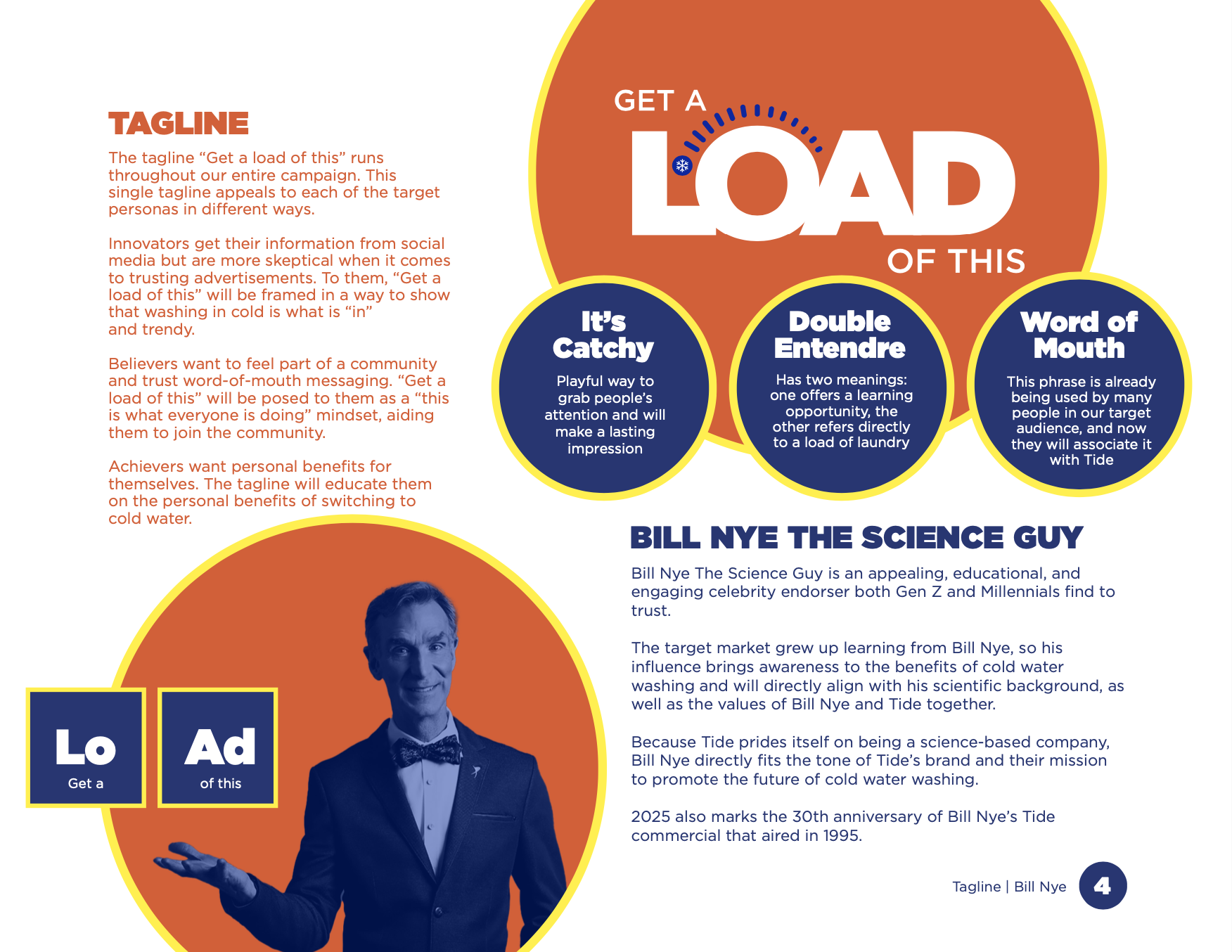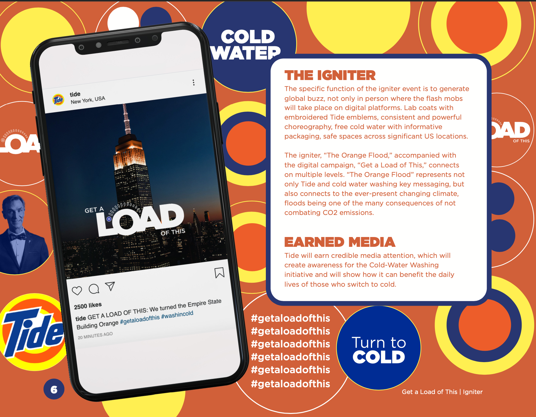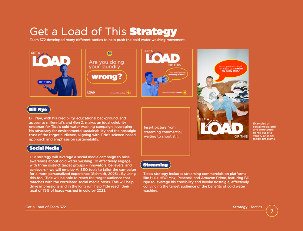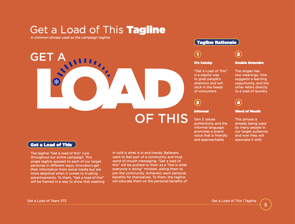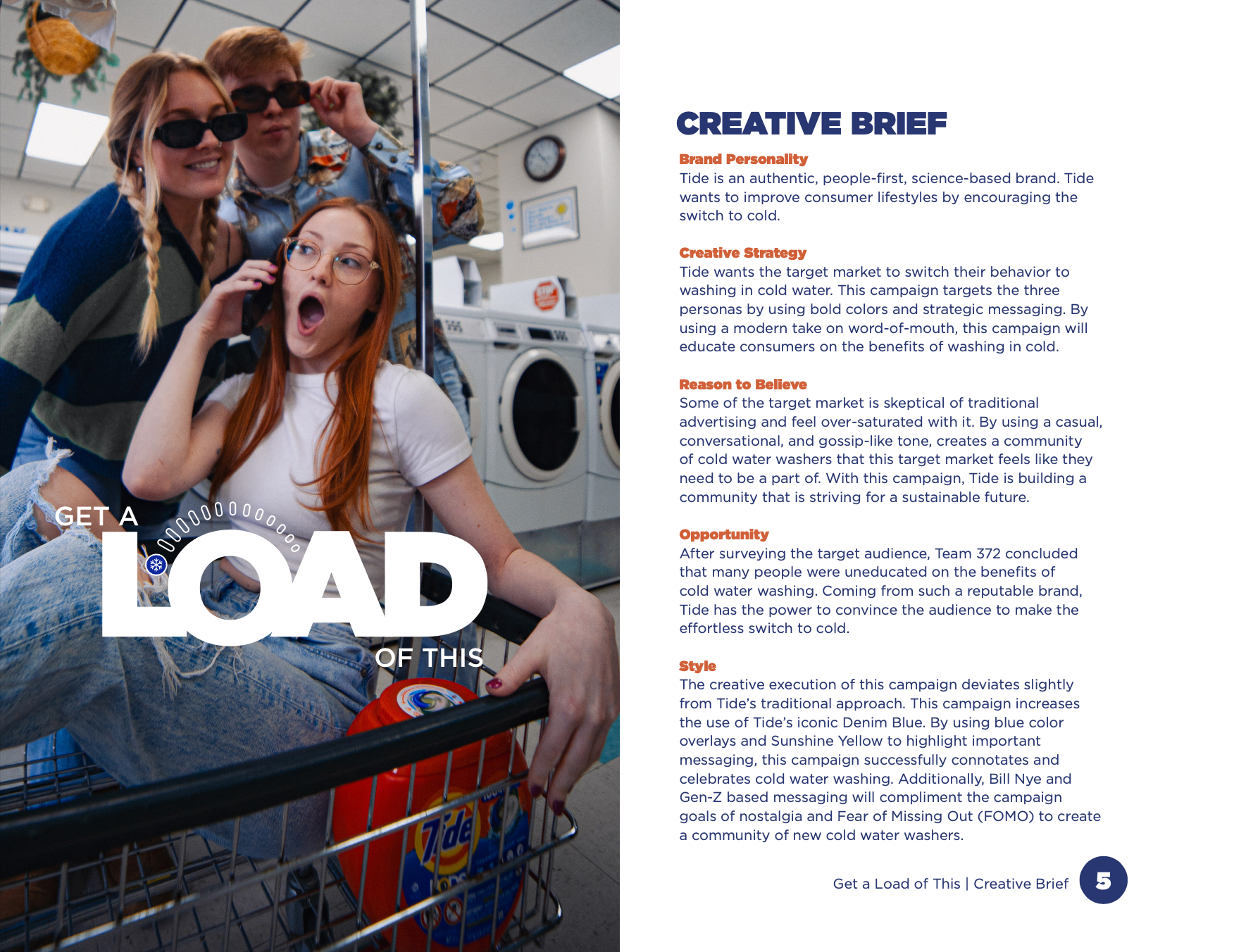 At the end of first semester, our class was assigned a final group project. We had to make a campaign for Tide. My group landed on my “Get a Load of This” tagline. Our campaign consisted of a social media series, a college ambassador program, and a cross marketing opportunity with Tide x The Color Run. This campaign wasn’t perfect, but it was a great start.