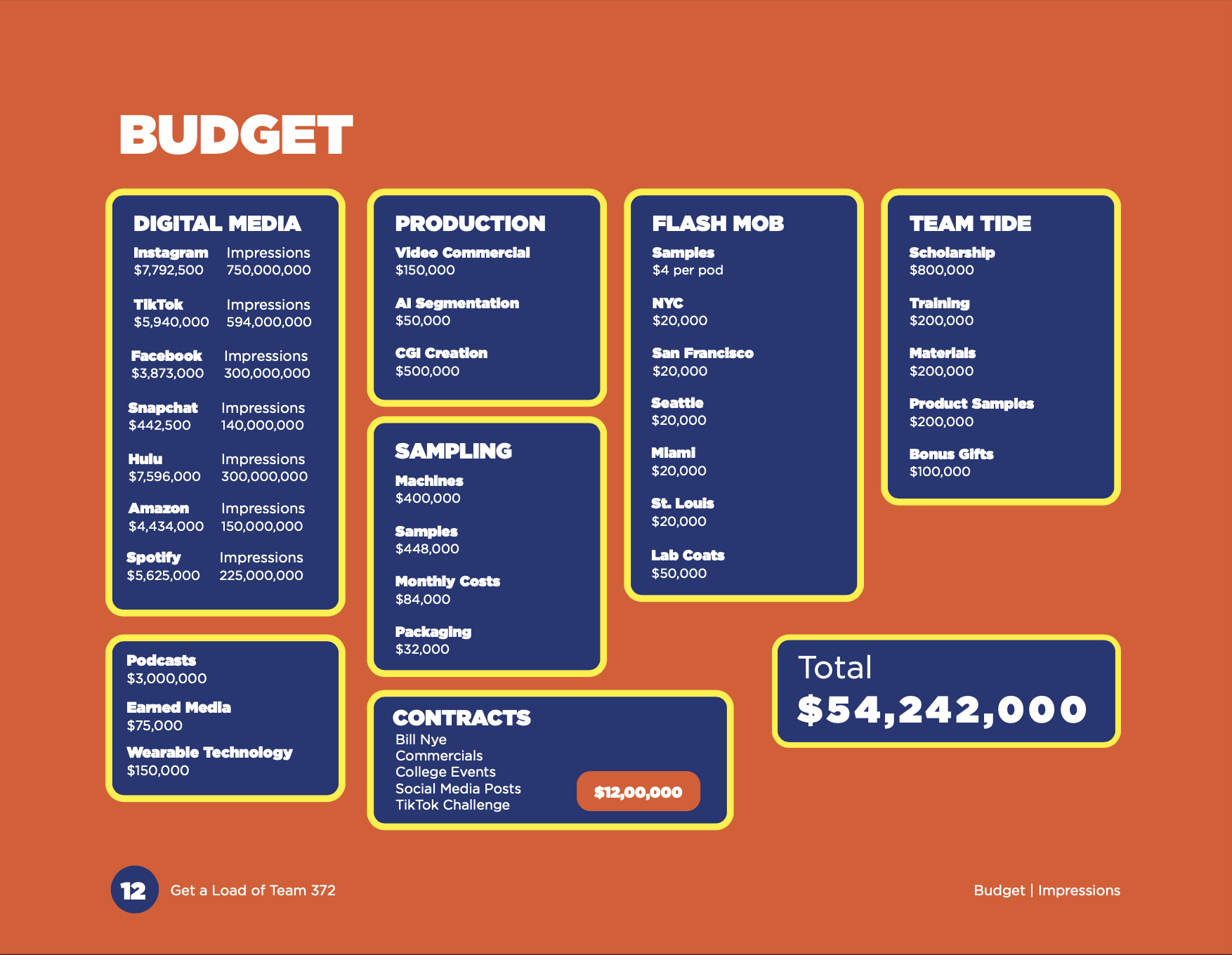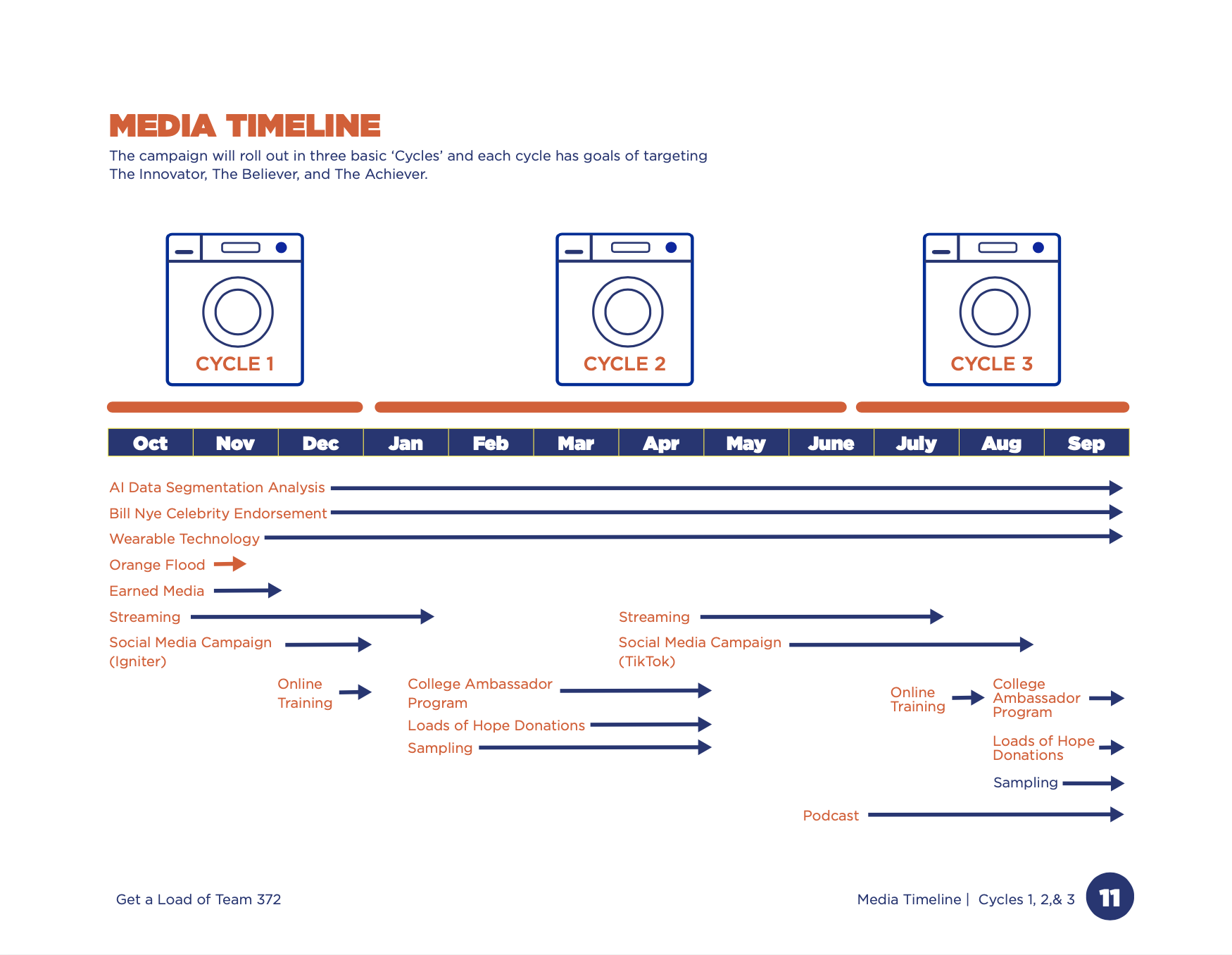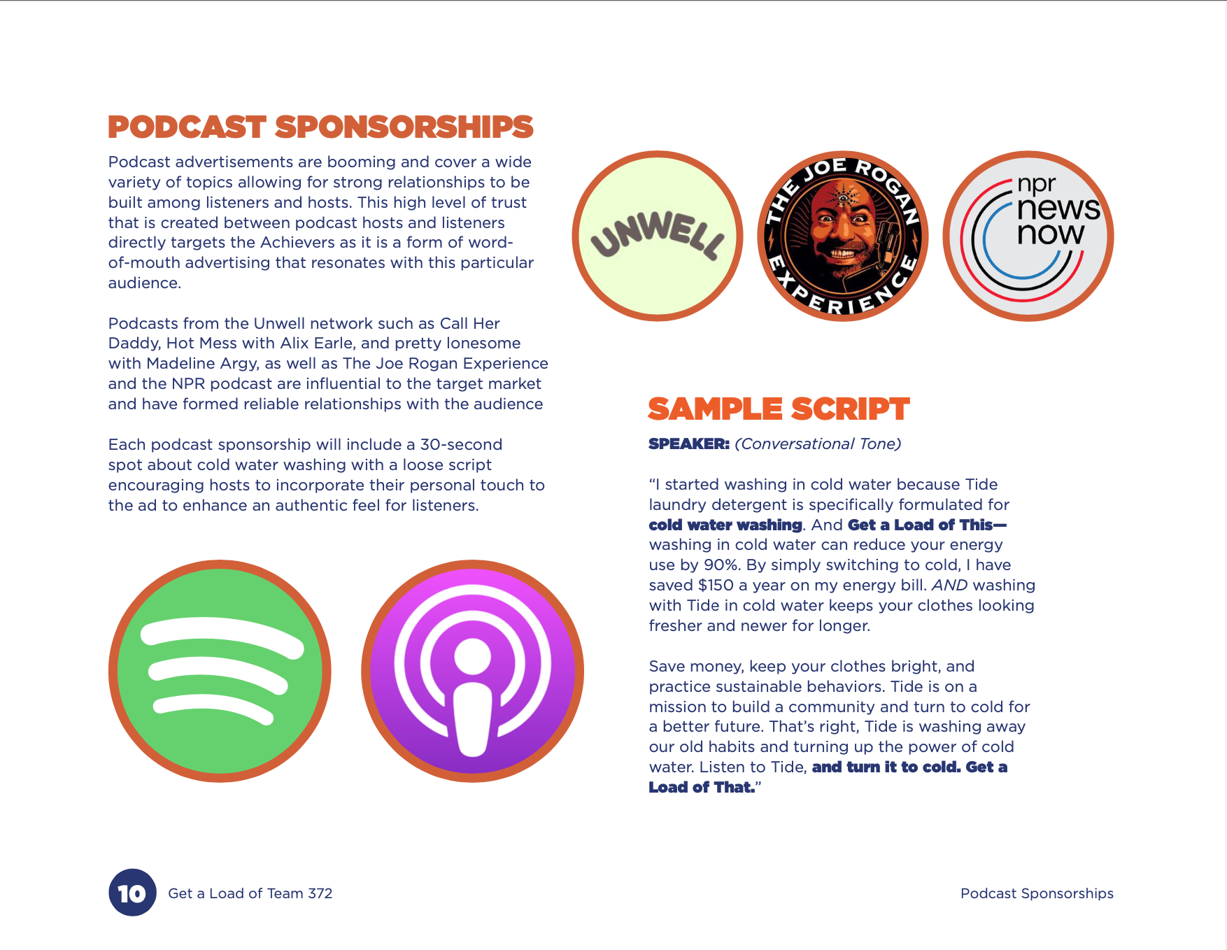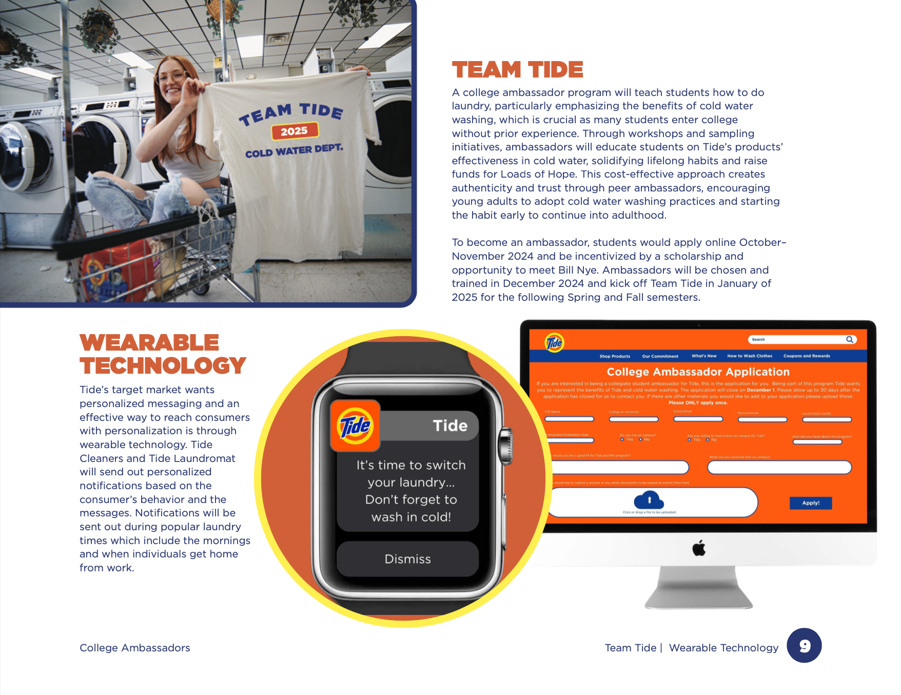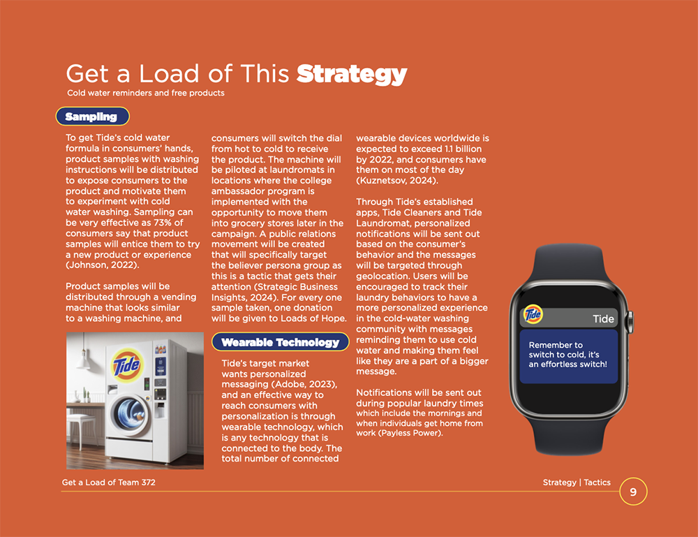 At the end of first semester, our class was assigned a final group project. We had to make a campaign for Tide. My group landed on my “Get a Load of This” tagline. Our campaign consisted of a social media series, a college ambassador program, and a cross marketing opportunity with Tide x The Color Run. This campaign wasn’t perfect, but it was a great start.