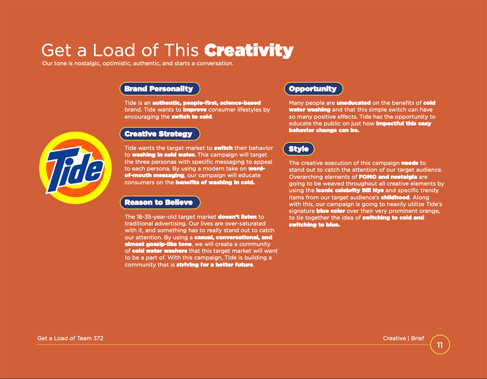I break up with that document for most of the semester because we just aren’t to that point yet. The purpose of the fall semester was to research. Research, research, research. I surveyed. I audited. I ate, slept, and breathed Tide. My notes were orange, blue, and yellow, written in Gotham. In order for me to understand this brand, I had to method act, I had to live the brand in order to create a campaign for it.
