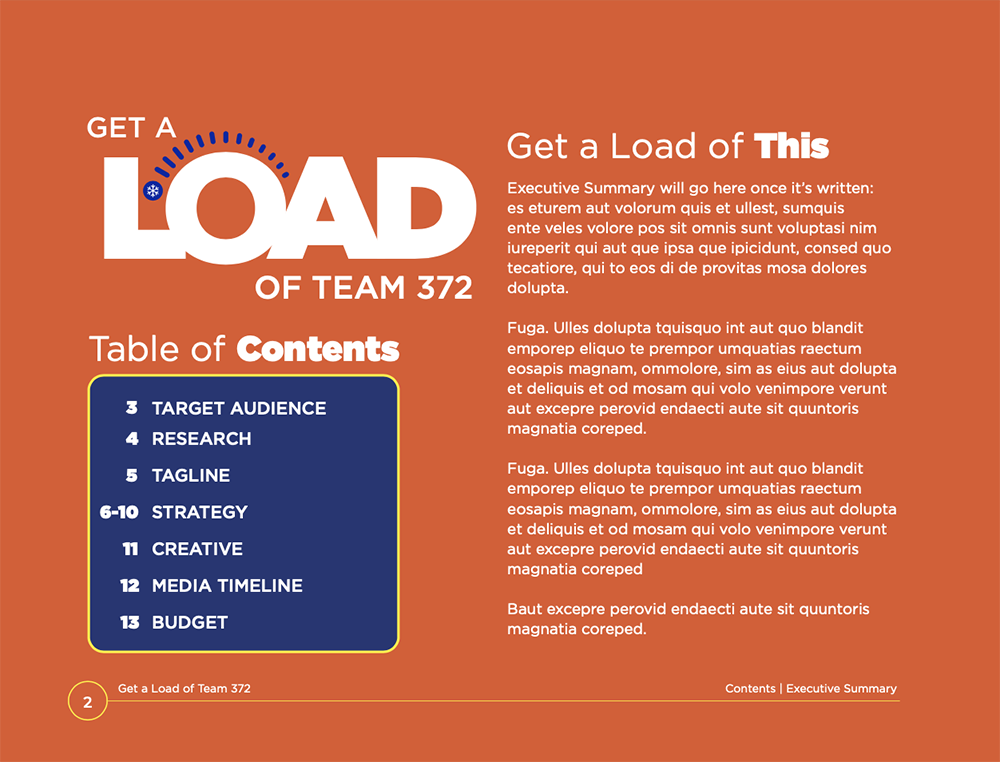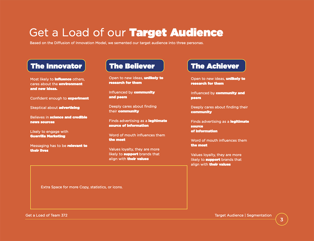 As the year rolled on, we started getting deeper and deeper into this campaign. Semester one flew by, and now on to semester two, the capstone. Our class separated into three loads (teams), research, strategy, and creative. I was elected into a team lead role of sorts, guiding the creative team alongside another classmate. I had my eye on the prize, designing the campaign pitch book, a project that has been a dream since the beginning of my college career.