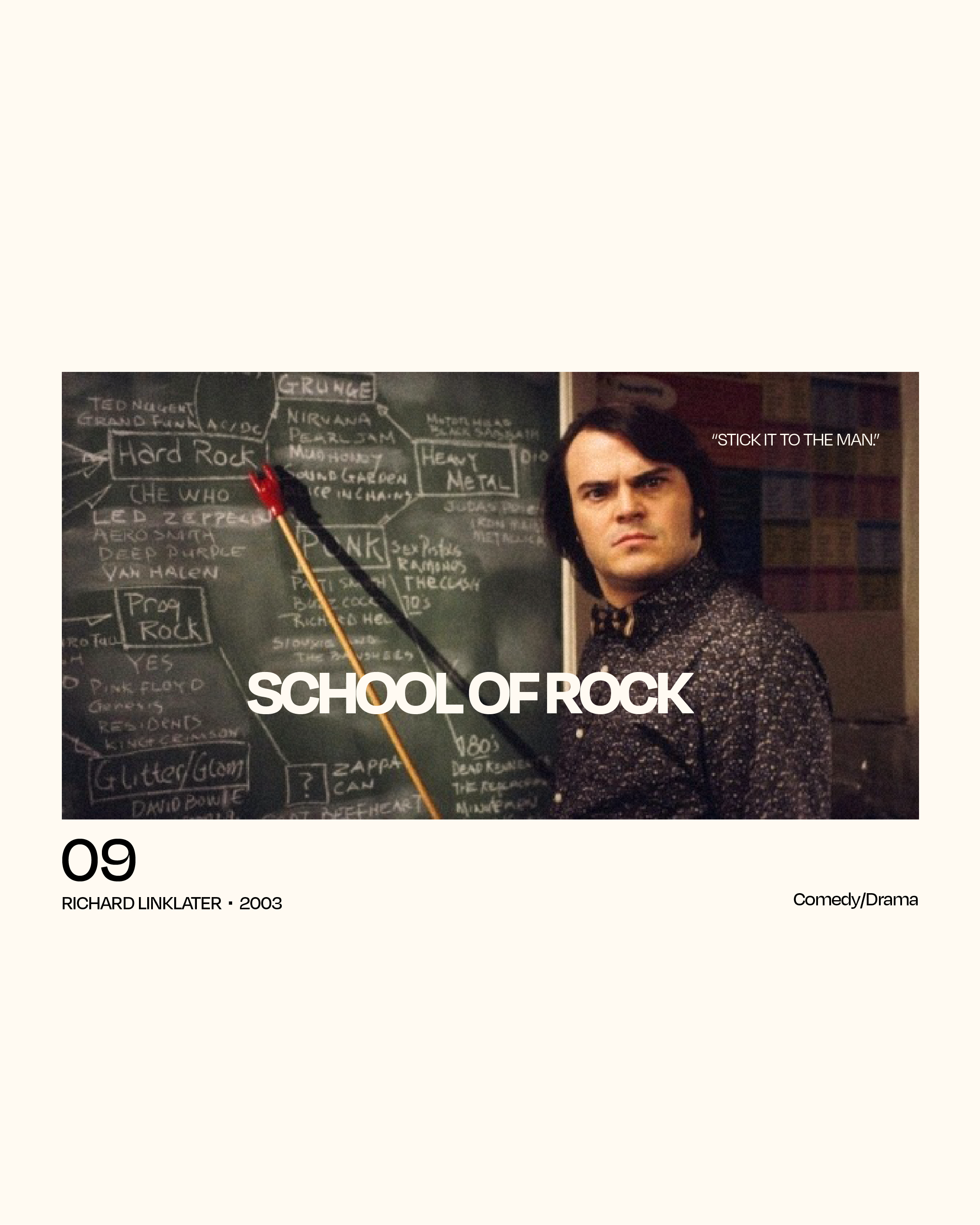 An incredible comedy I grew up on (my god I love Jack Black movies). Dewey Finn feels like a loser after getting kicked out of his band, scrambling to find a means of making money, when he pretends to be his roommate, Ned Schneebly, and gets a job as a substitute teacher at a prestigious private elementary school. Instead of teaching the kids multiplication, he lectures about rock n’ roll and morphs them into a rock band with hopes of winning a local music competition (beating his ex band while they’re at it).