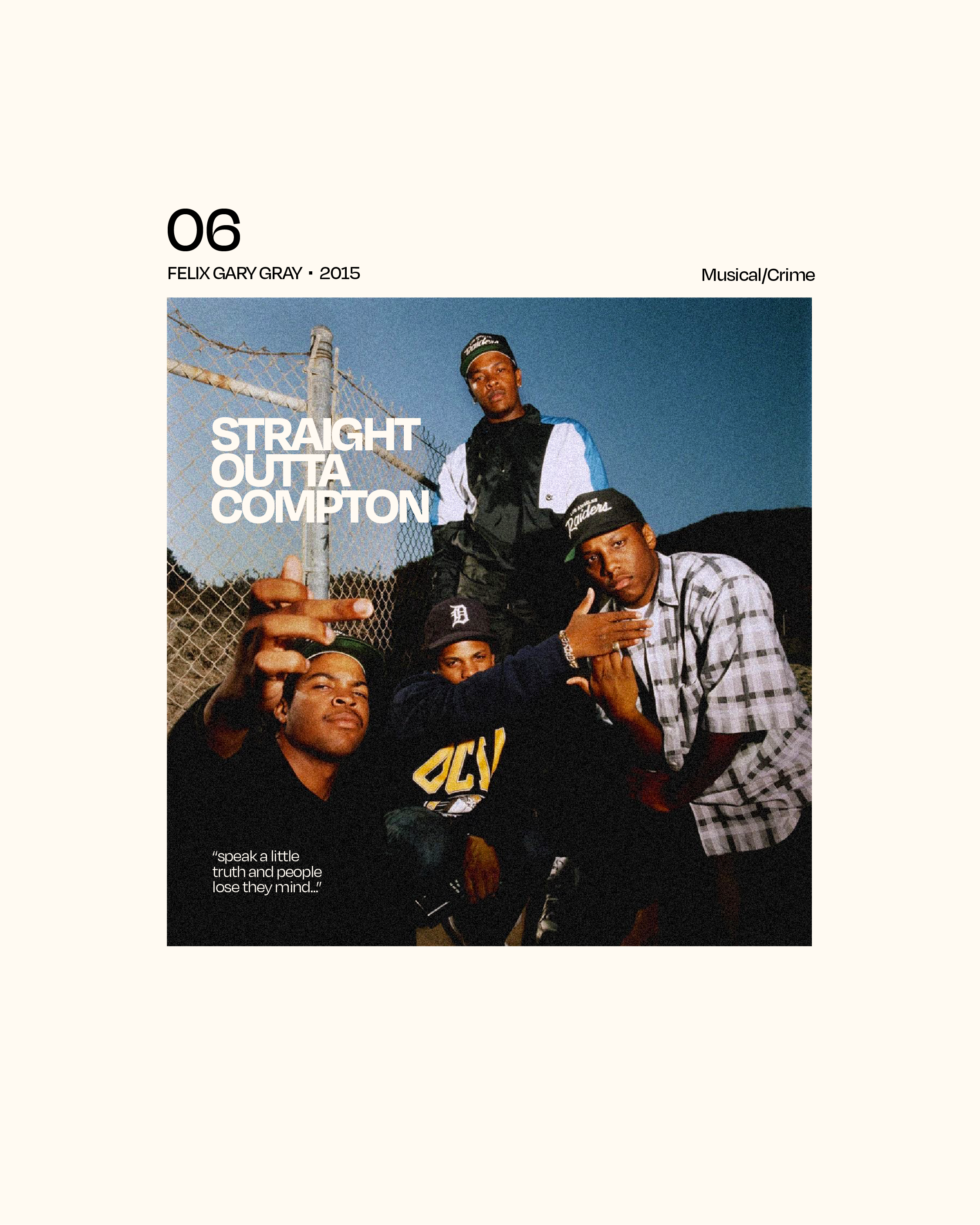 The year is 1988, and a new rap group, N.W.A., is on the scene. The group changes music industry and rap culture forever by their damning lyrics and loud stage presence. Eazy-E, Ice Cube, Dr. Dre, DJ Yella, and MC Ren rap about what it means to be a black man in not only Compton, but in America. They urged Americans to wake up and pushed for change as they continued to create music. The group faced external AND internal challenges, ultimately leading them to break up and experiment with their solo careers. This rap beef led to some of the hardest diss tracks of all time.